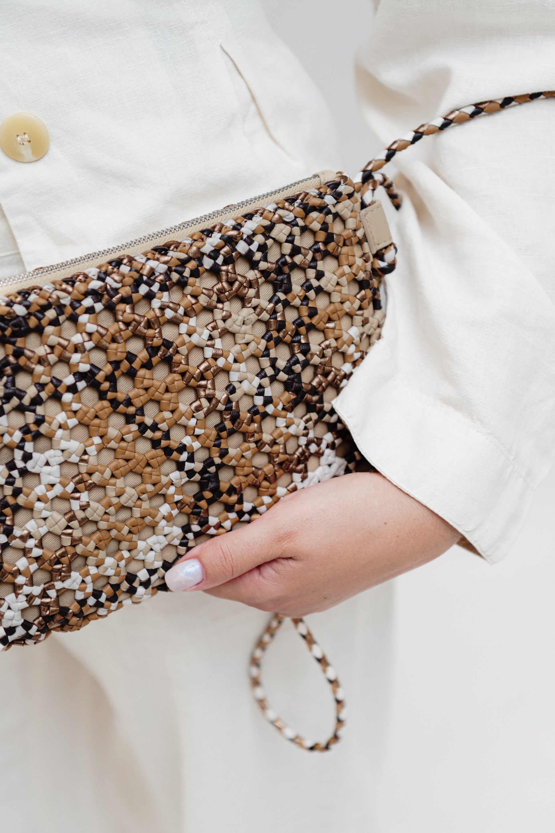 Superhandige kleine crossbodytas in multicolors. De kleuren bestaan voornamelijk uit beige, ecru, brons en donkerbruine tinten. Lange geweven leren schouderband en zilveren ritssluiting.
