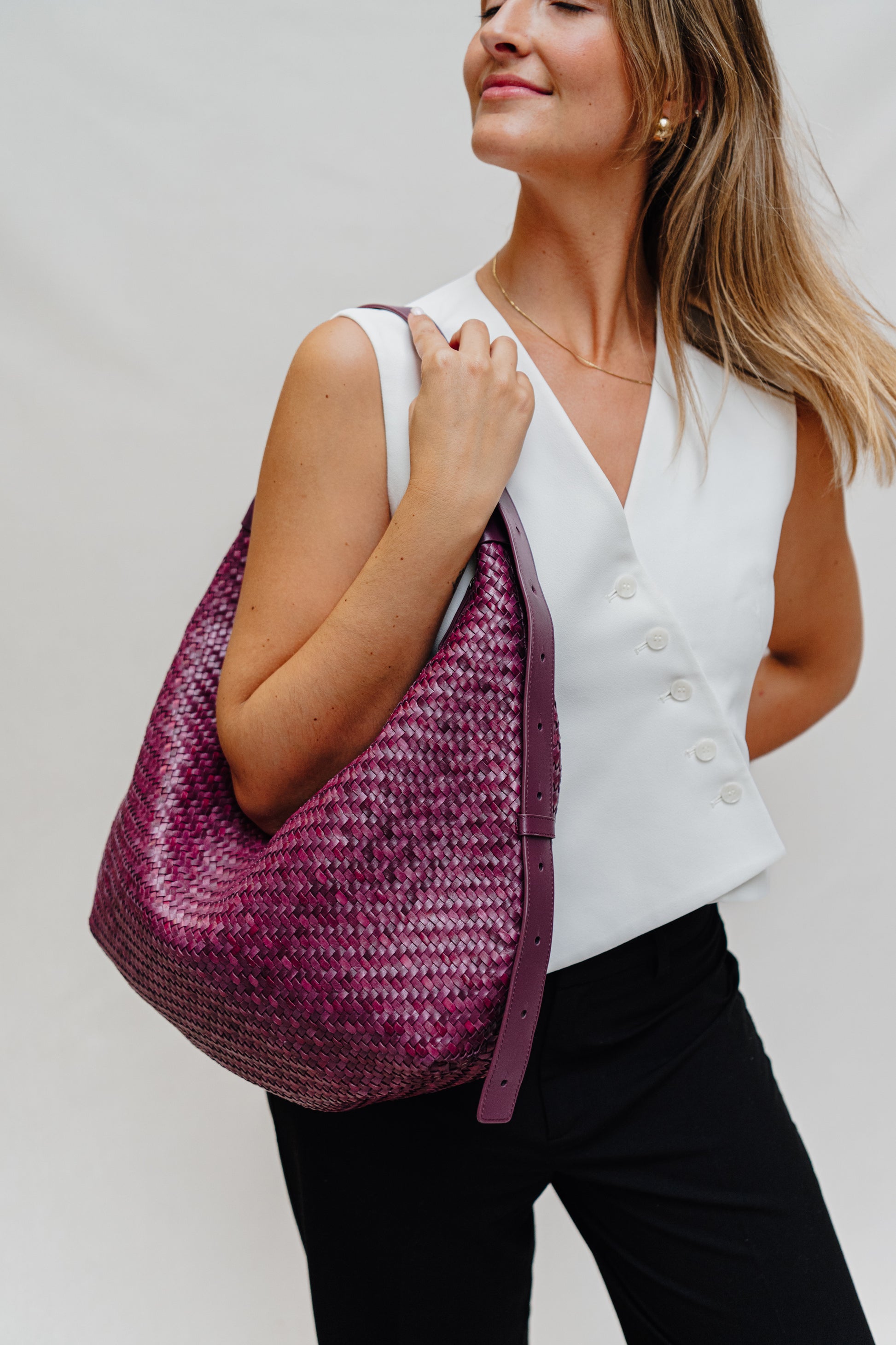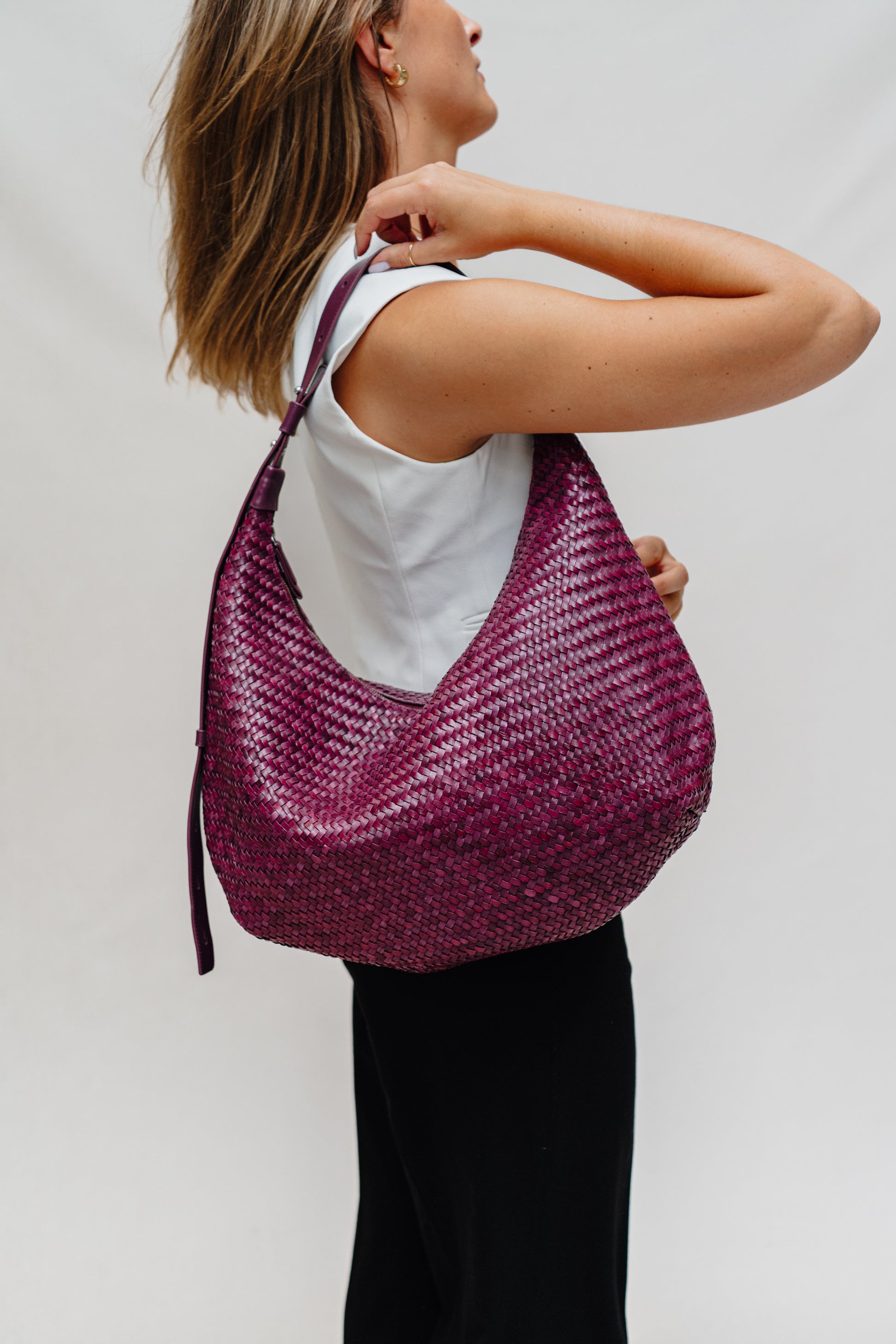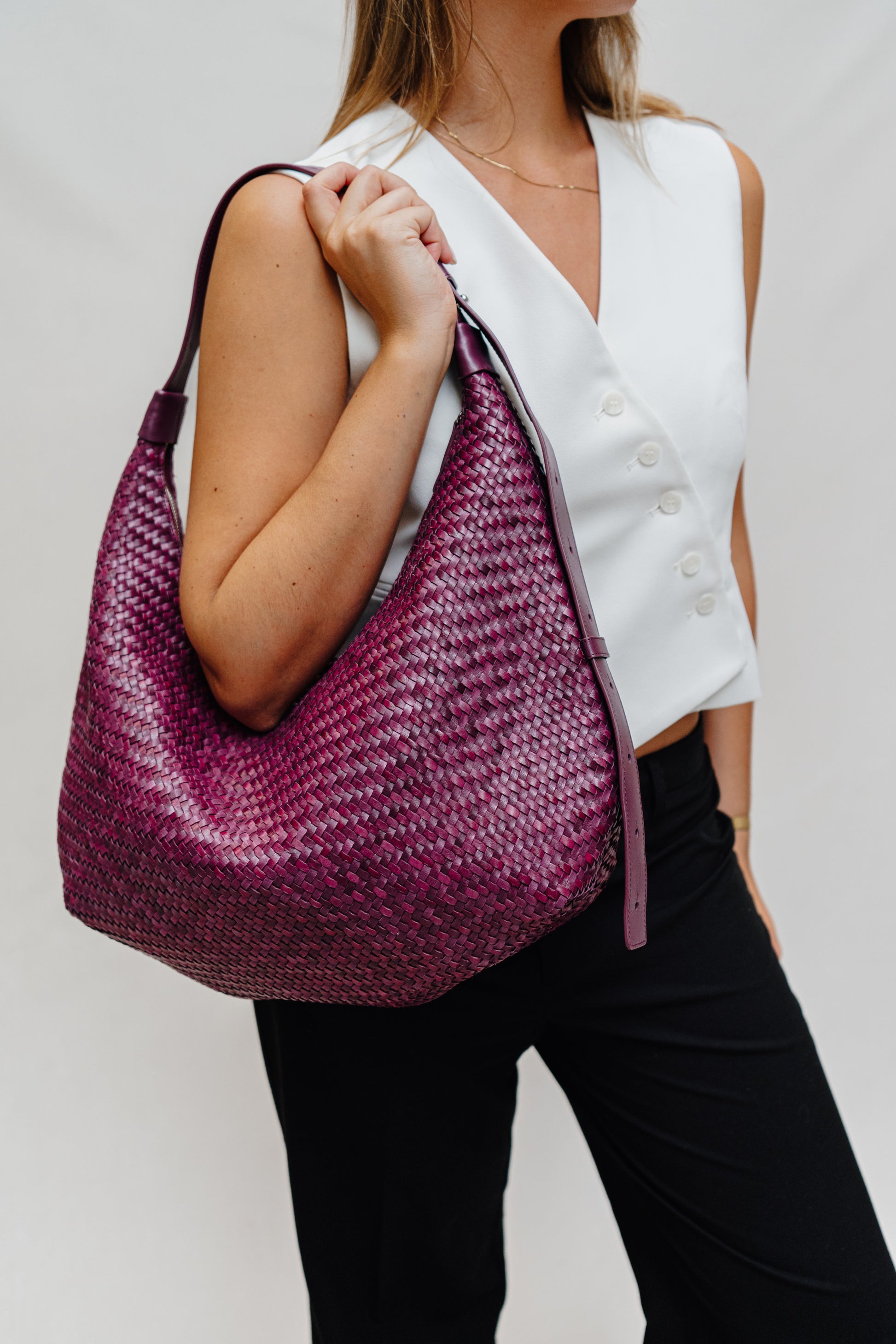 Grote prachtige unikleur geweven leren tas met herstelbare band en zilveren rits.
