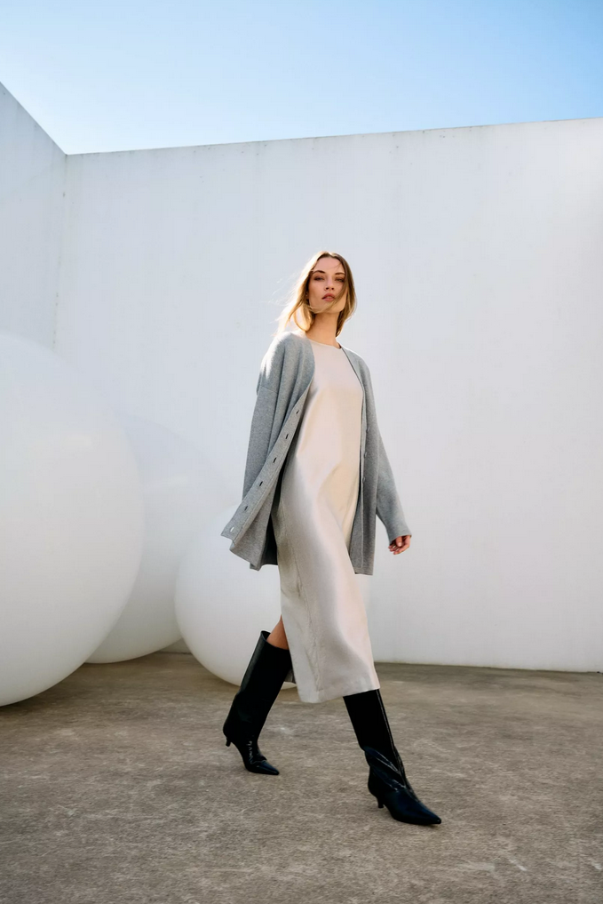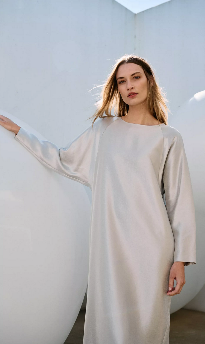 Deze kuitlange jurk in zilverkleurig satijn met een subtiele vintage structuur is pure easy elegance. De rechte snit valt soepel langs het lichaam, terwijl de vleermuismouwen zorgen voor een lhedendaagse look. Of je nu kiest voor hakken en statement oorbellen of sneakers en een leren jasje — deze jurk past zich moeiteloos aan jouw stijl aan.