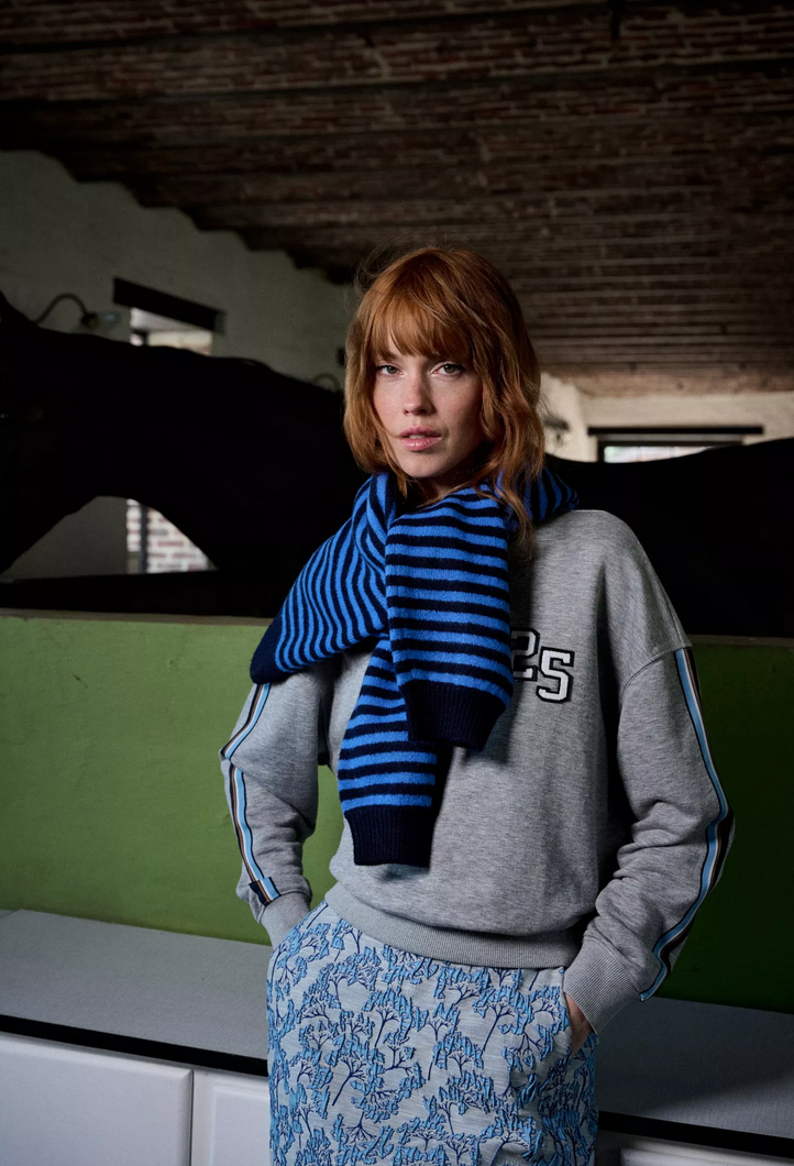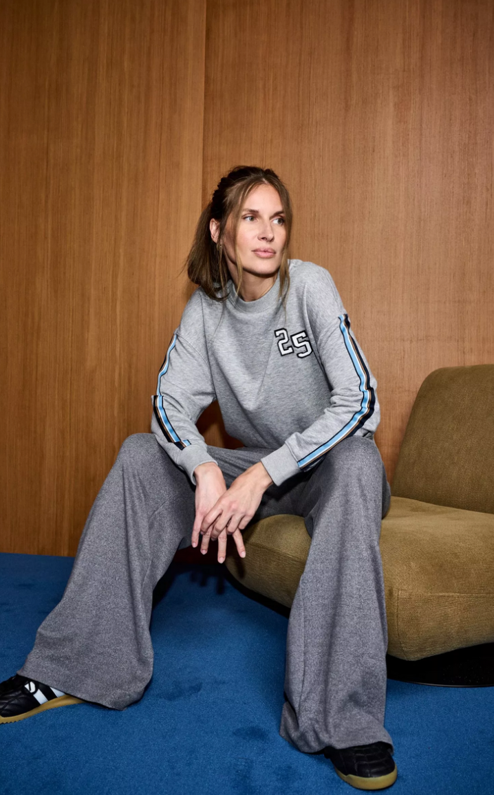 Streelzacht sweatshirt met varsity vibes: gestreepte bies op de mouw, cijfers op de borst. Casual genoeg voor je denim, chic genoeg om een geklede look te ontspannen.