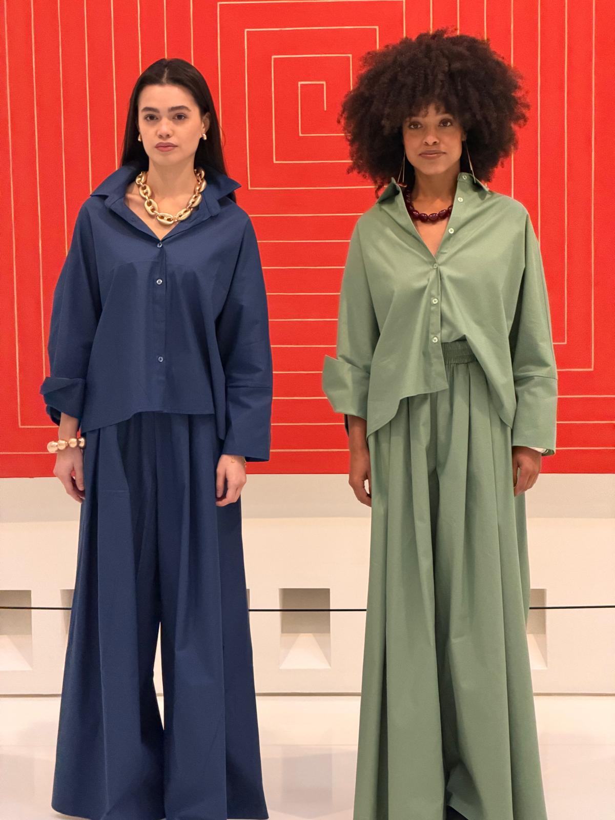 Soepele, zeer wijde broek met plooien die lager geplaatst zijn voor een flatterend effect. Elastiek in de taille en steekzakken vooraan. Kan gecombineerd worden met de bijpassende wijde blouse ervan.
