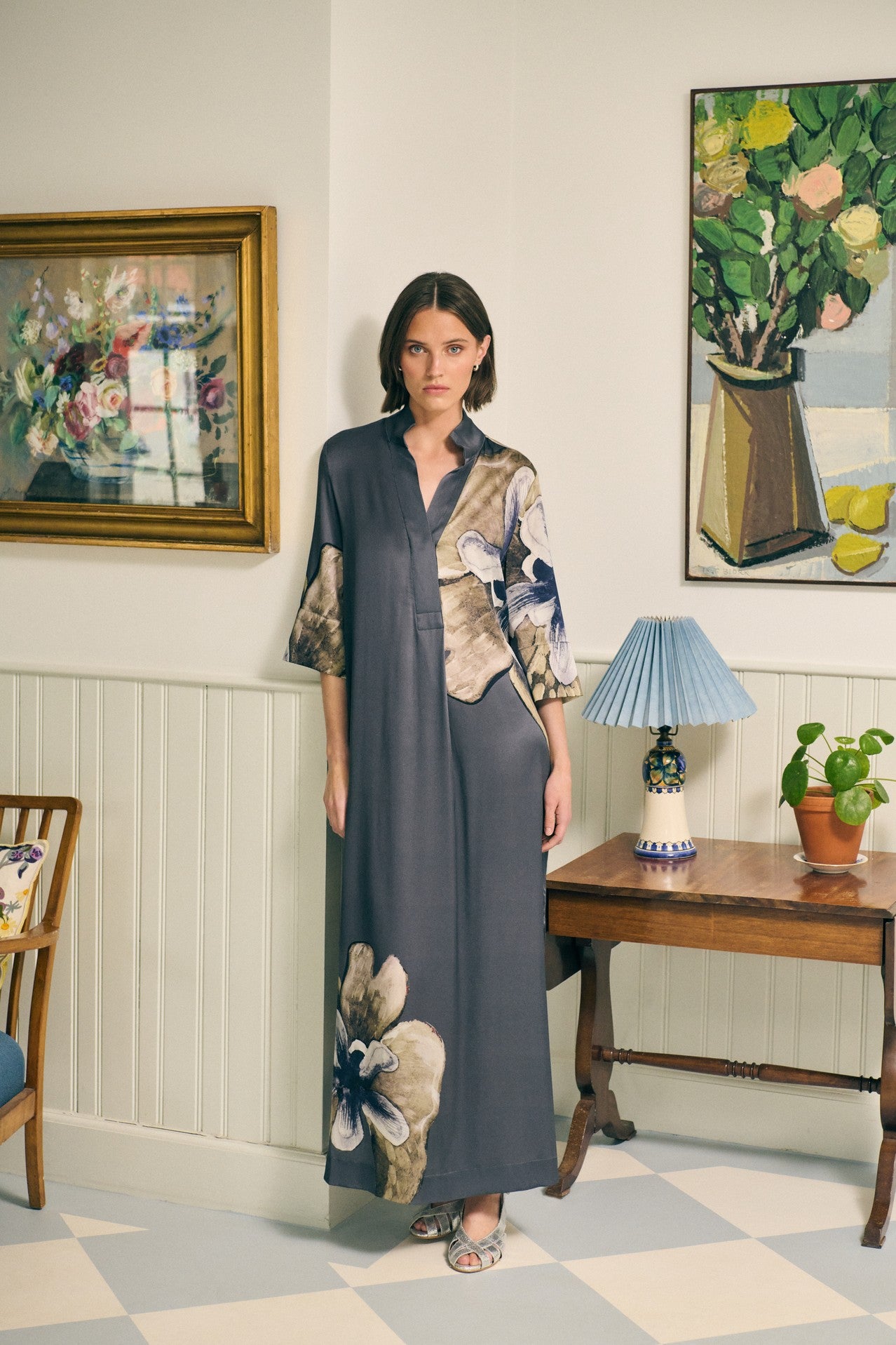Helga, een geliefde klassieker van DEA KUDIBAL, is een comfortabele, lange jurk met een kimono-achtige halslijn, opstaande kraag en wijde driekwartmouwen. Deze versie is uitgevoerd in zijde met een sobere grijze print. Ideaal voor een klassevol feest.