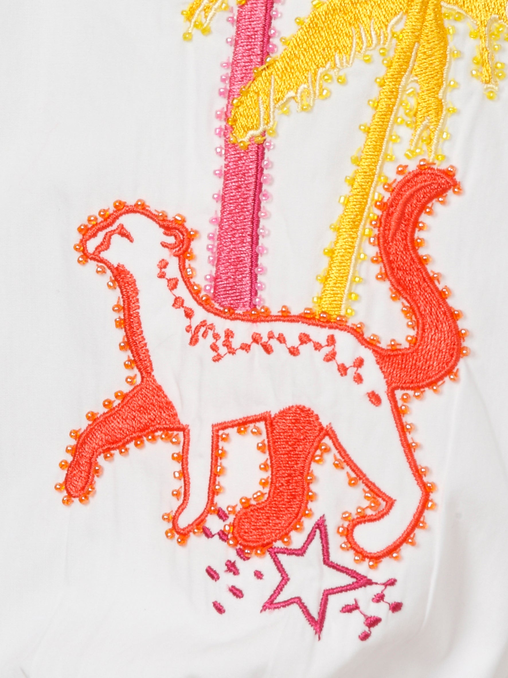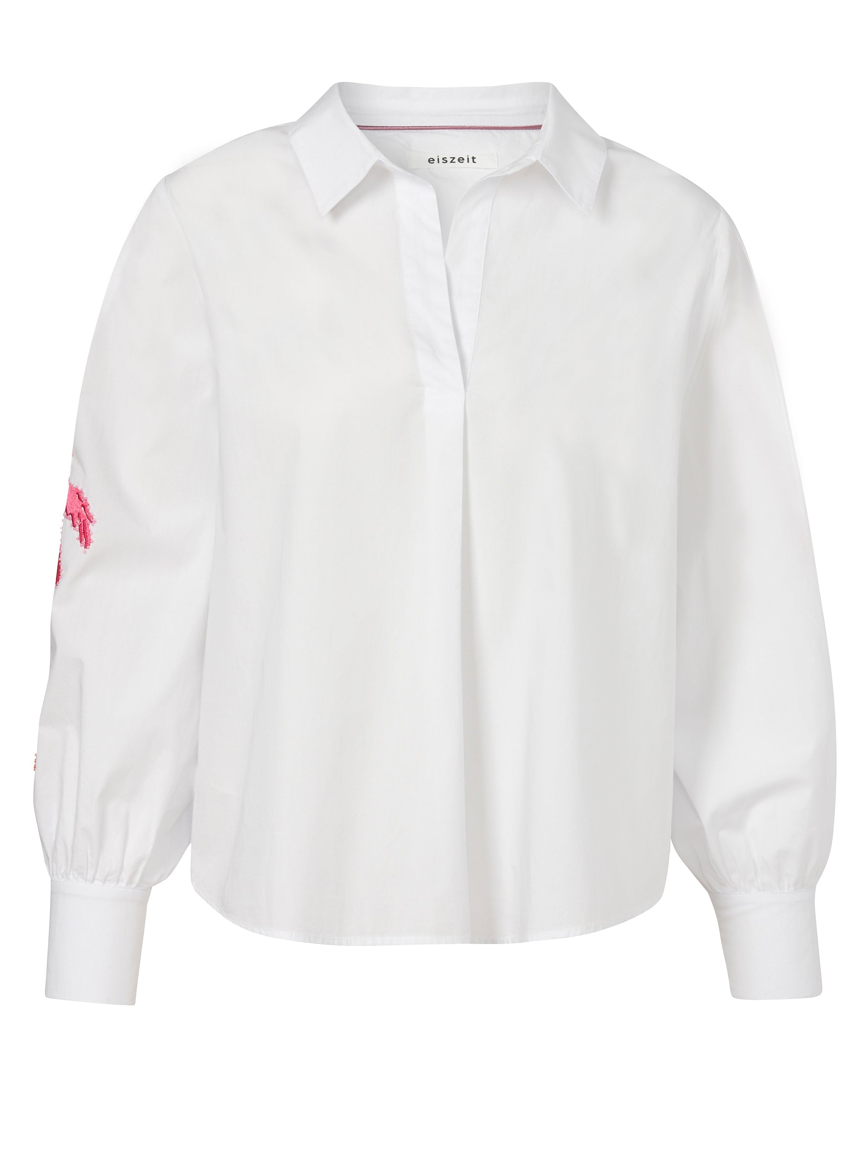 Mooie 100% katoenen witte blouse met kleurrijk borduursel en pareltjes op de mouwen. Mooie kraag en V-hals tot aan de buste. Geen knoopjes.