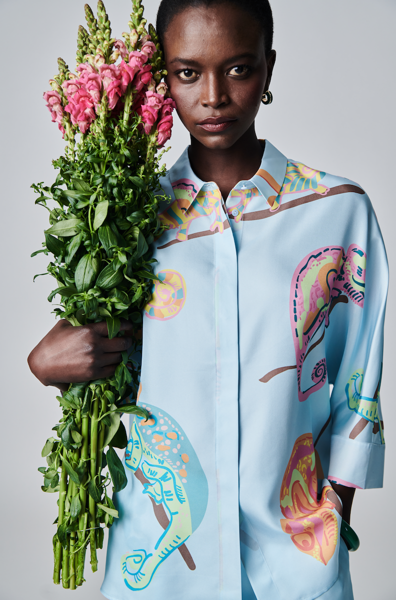 Prachtige zijde blouse met kleurrijke chameleons op een lichtblauwe achtergrond. Mooie kraag en 3/4 raglan mouwen.