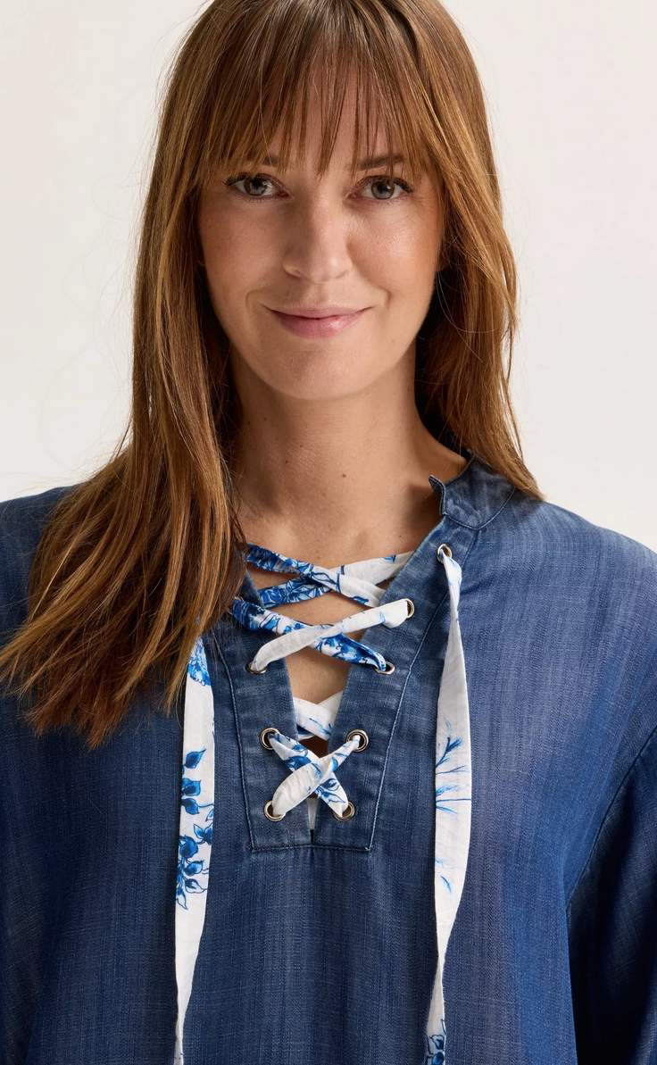 Een lange, luchtige tuniek in soepel lyocell‑denim die meteen boho‑chic uitademt. De afgeronde zoom en subtiel geplooide mouwen geven een ontspannen elegantie, terwijl de relaxte fit het hele jaar door heerlijk zit. Extra leuk detail: je kiest zelf de vibe met twee vetrsluitingen — één in denim en één met een frisse Delfts‑blauwe print.