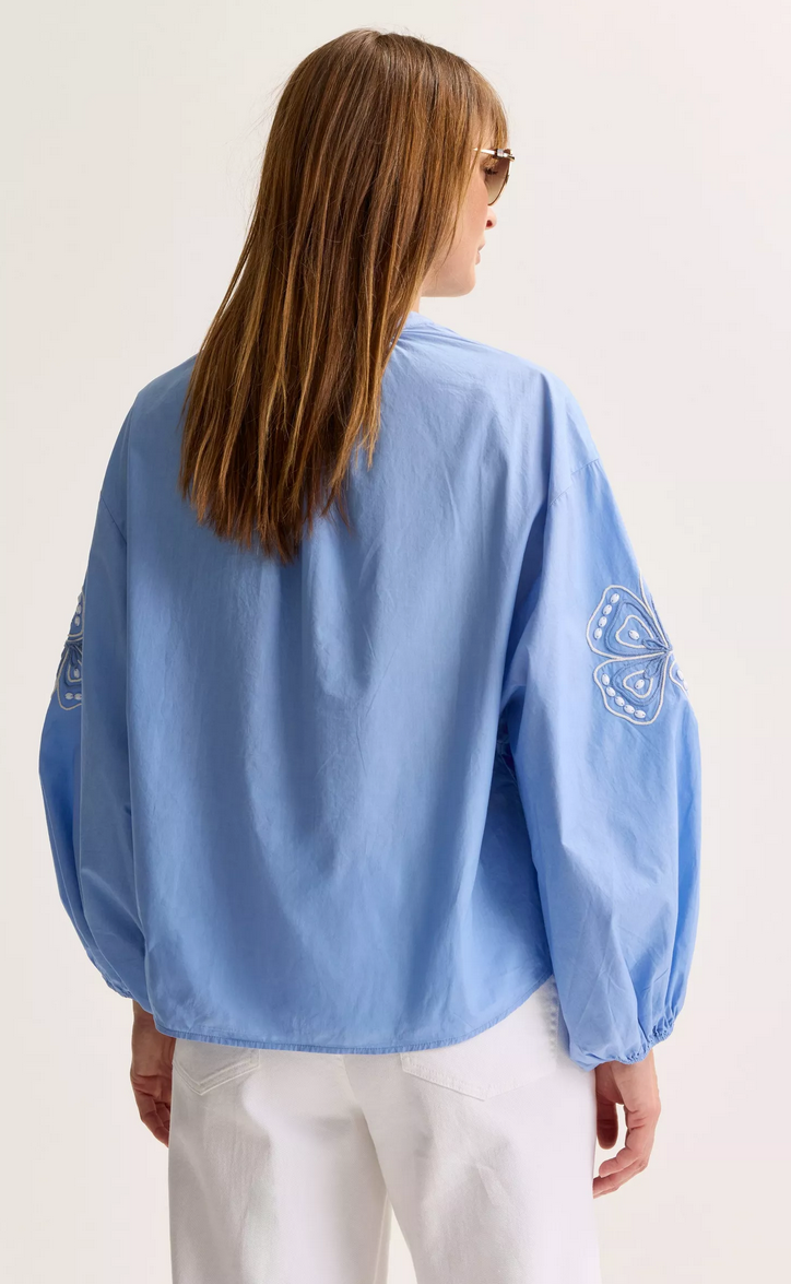 Zomerse boho‑energie in zijn puurste vorm: een lang, wijd katoenen shirt zonder kraag, licht als een bries en vrolijk als een festivaldag. De aangefronste rug en royale ballonmouwen geven een speels volume, terwijl het fijne piping‑borduurwerk met kralen subtiel schittert. Afgeronde zoom, nacréknoopjes en een vleugje vrijheid in elke plooi.