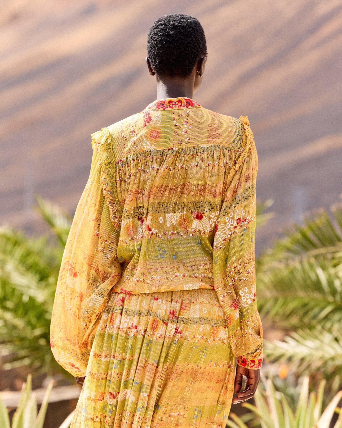 Een verfijnde chiffon blouse versierd met glinsterende lurexdraden, die de stof een subtiele schittering geven. De blouse heeft delicate ruches op de schouders, kleurrijk borduurwerk op de kraag en manchetten, en lange, zwierige mouwen die een luchtig silhouet creëren. Sluiting met kleine parelmoeren knoopjes aan de voorkant. Combineer hem met de bijpassende broek voor een poëtische en stralende outfit.