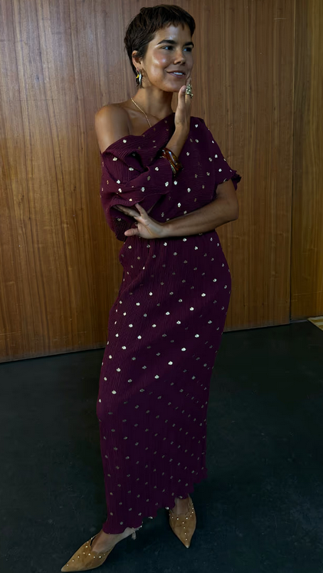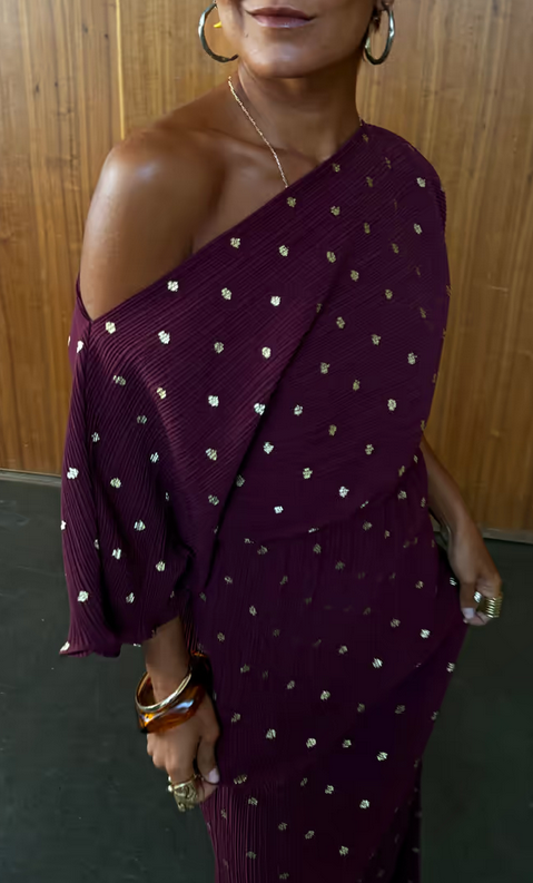 Hun bestverkochte Tilly-jurk in een prachtige nieuwe kleurstelling! Dankzij het licht relaxte silhouet kun je hem off-shoulder stylen, terwijl de rekbare plisséstof en elastische tailleband hem super draagbaar maken en perfect voor een avondje uit! De krulzoom en subtiele gouden spikkels voegen een vleugje elegantie toe en vangen het licht prachtig in de zon.