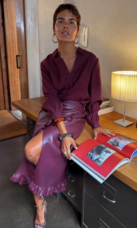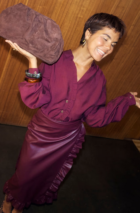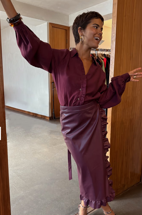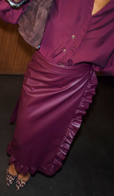 Een nieuwe editie van hun bestverkochte rok van vegan leer! Met prachtige ruches langs de zijkant en zoom, perfect om in de zon door de stad te paraderen of te combineren met kitten heels voor een stijlvolle date night look. Het soepele vegan leer zorgt voor een vloeiende beweging tijdens het lopen, en met de extra wikkeltaille zit hij altijd fantastisch. Hij kan op meerdere manieren worden geknoopt, afhankelijk van de stijl/hoeveelheid bedekking die je wenst.