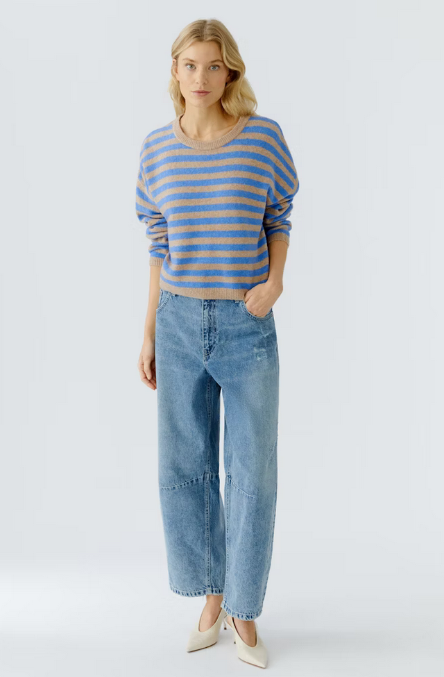 Superzachte gestreepte trui in een moderne vorm: oversized en opvallend kort model. Ronde hals met dubbel gebreide boorden. Verlaagde schouder, valt losjes tot aan de lange mouw. Korte geribbelde boorden aan de mouw en zoom.