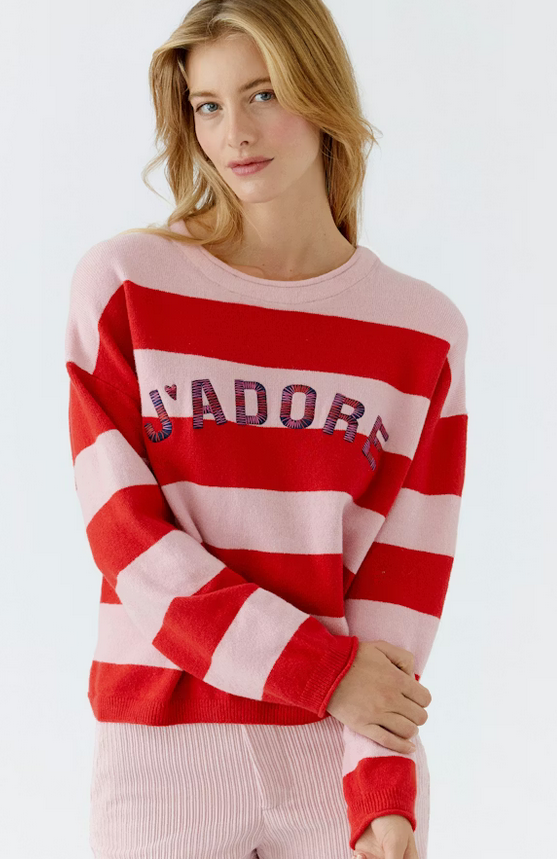 Een echte knuffelpullover met brede afwisselende rode/roze strepen en boorduurwerk vooraan. Ruime ronde hals met ribboord en omgeslagen zoom. Verlaagde schouders, valt losjes naar lange mouwen met omgeslagen zoom.