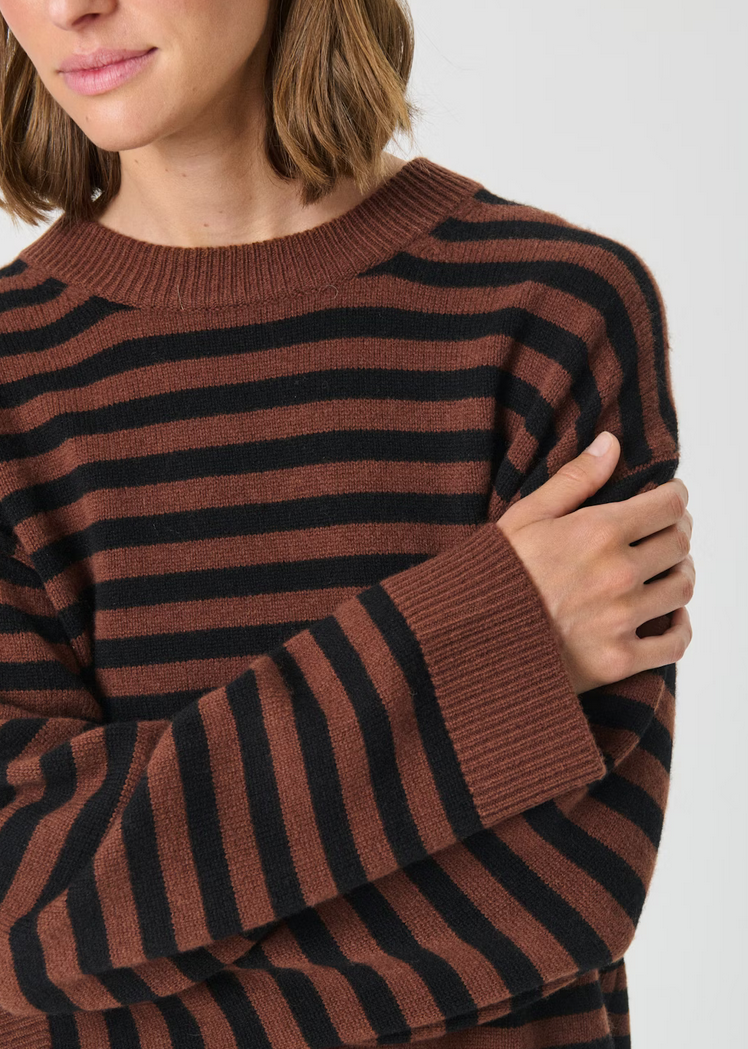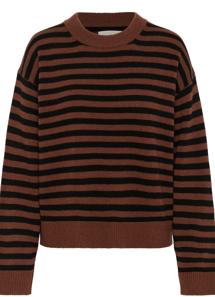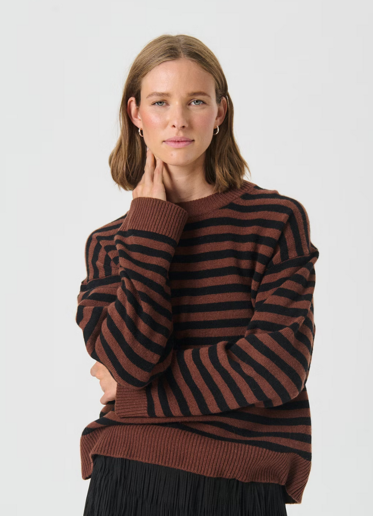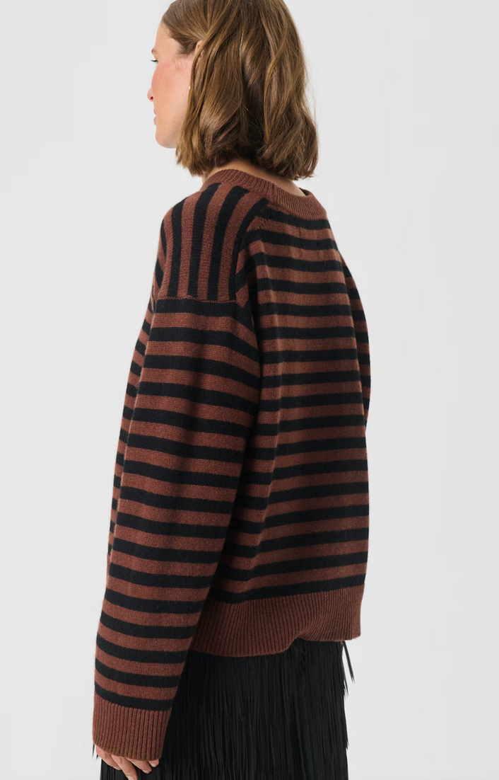 Deze gebreide trui heeft smalle zwarte en bruine strepen, een relaxte pasvorm en brede geribbelde boorden. Het klassieke ontwerp krijgt een moderne update met een eenvoudige snit en zachte textuur. Perfect voor dagelijks gebruik – combineer met een rok of jeans voor een relaxte maar stijlvolle look.