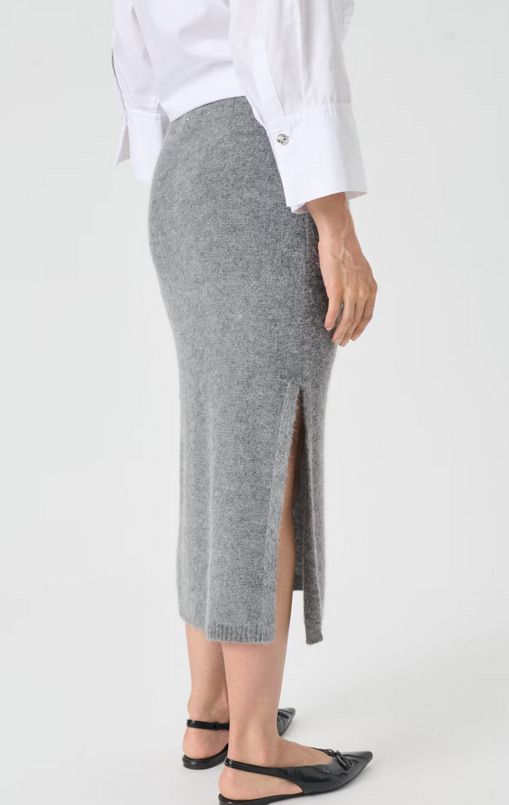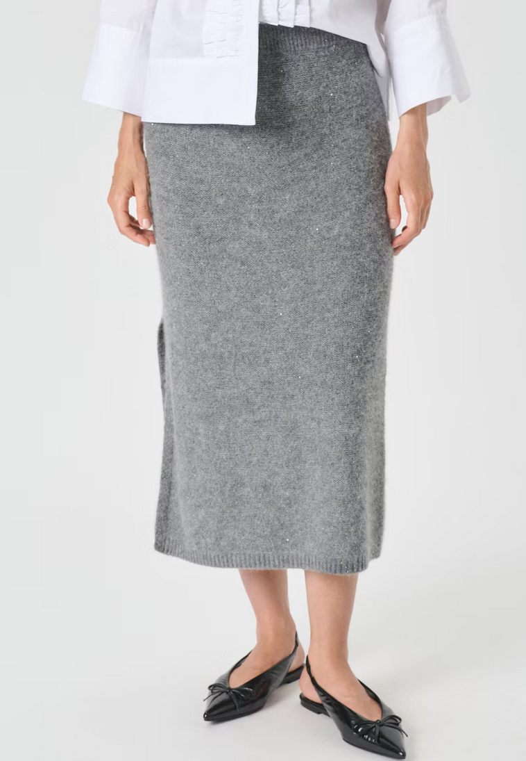 Deze zachte gebreide rok in grijs melange heeft een aansluitend silhouet en een midi-lengte met een zijsplit. De elastische tailleband zorgt voor comfort en bewegingsvrijheid. Combineer hem met een shirt voor een klassieke look of met een bijpassende trui voor een relaxte feel. Kan met bijpassende vest gecombineerd worden.