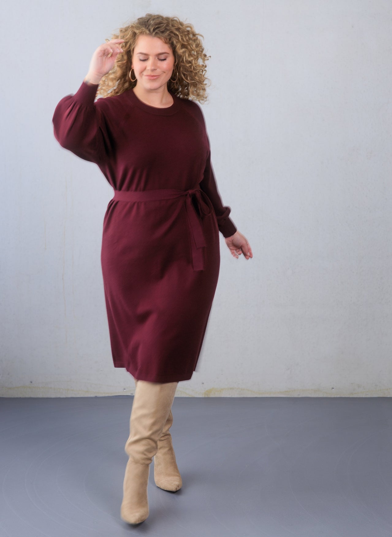 Een comfortabele gebreide jurk met stijlvolle details. Deze jurk valt tot op de knie, heeft ballonmouwen en een afneembare strikceintuur die je taille subtiel accentueert. De gebreide stof voelt comfortabel aan en maakt dit item perfect voor de herfst. Verkrijgbaar in port of zwart, makkelijk te combineren met laarzen.